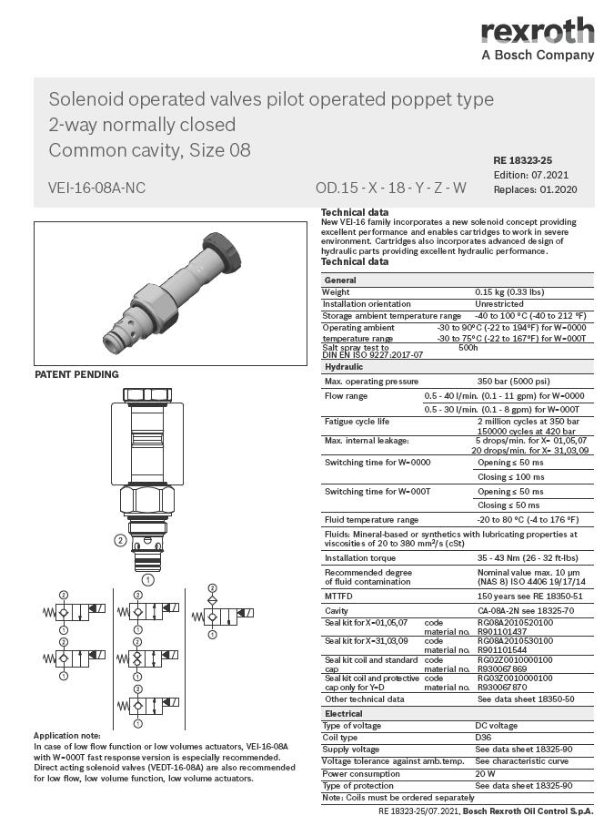 REXROTH Oil Control插装阀阀块耐压350bar,高强度碳钢制造。电磁阀分为常开,常闭两类。常开阀规格有三种:08规格流量0.5--40升/分,10规格流量2--70升/分,12规格流量5--150升/分。电压一般24V DC.常闭阀规格有三种:08规格流量0.5--40升/分,10规格流量2--70升/分,12规格流量5--150升/分。电压一般24V DC.
